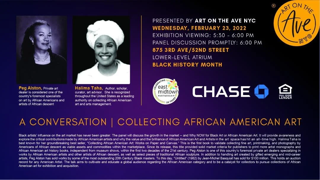 On February 23, 2022, the East Midtown Partnership and Art on the Ave hosted a panel discussion on "Collecting African American Art" as part of our public art exhibition, "Intersections," and in recognition of Black History Month. Joining us were Peg Alston, a private art dealer who is considered one of the country's foremost specialists on art by African Americans and artists of African descent, and Dr. Halima Taha, an author, scholar, curator, and art advisor who is recognized throughout the United States as a leading authority on collecting African American art and arts management.