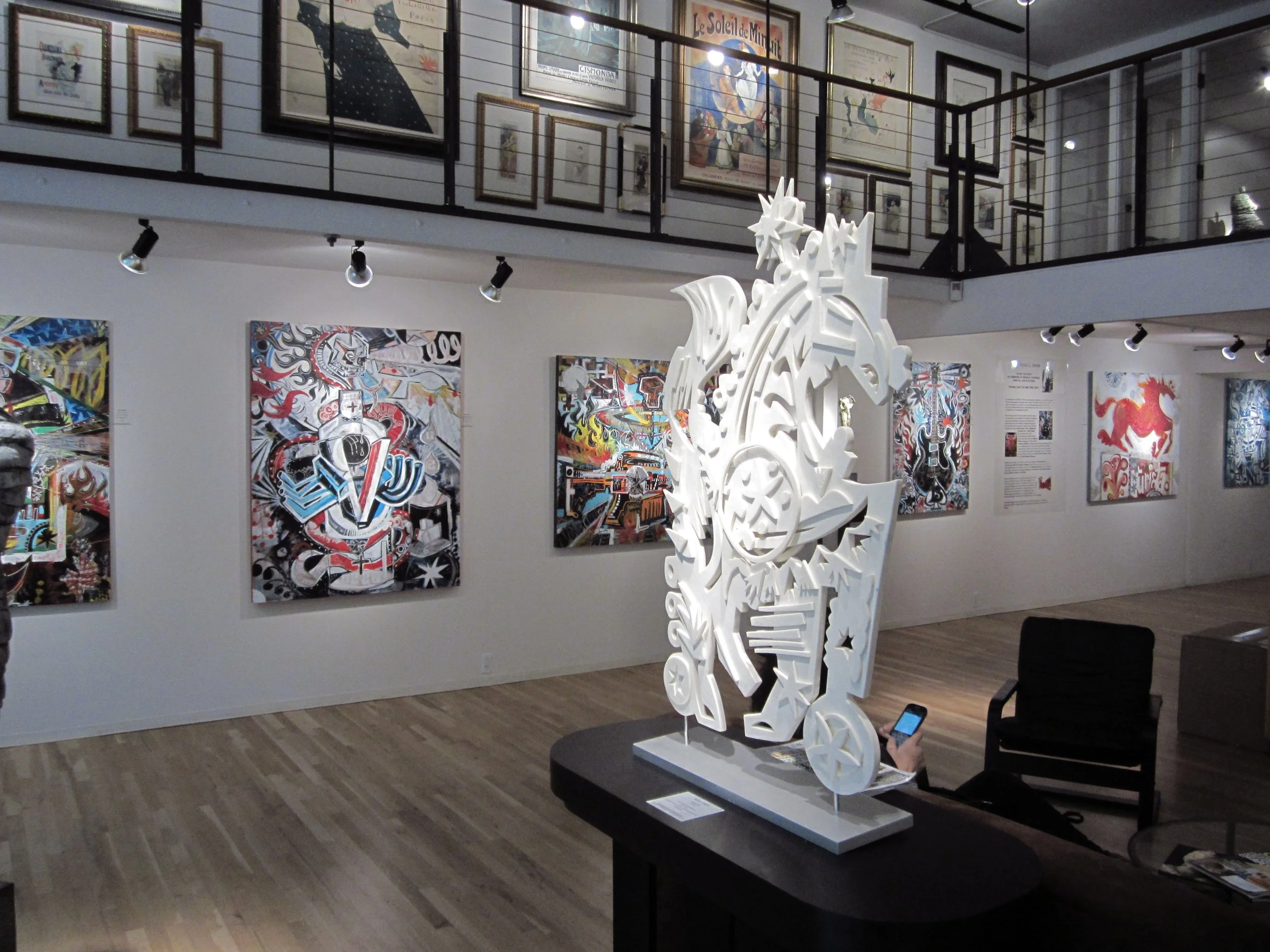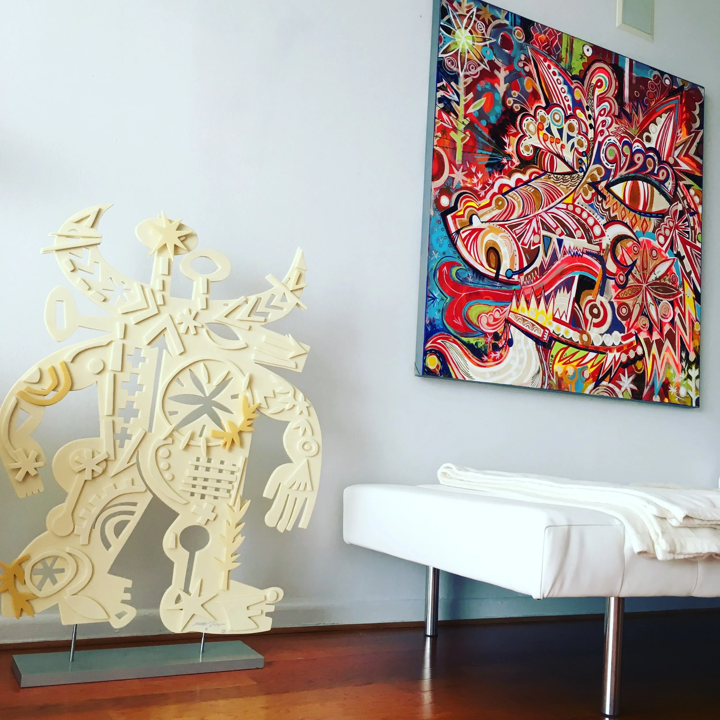 Smith continues to develop his personal visual language, working in a dizzying array of two-dimensional media, including works on paper, canvas, found objects and wood. The artist also has an affinity for linoleum block printing and started working in sculptural media in 2008.